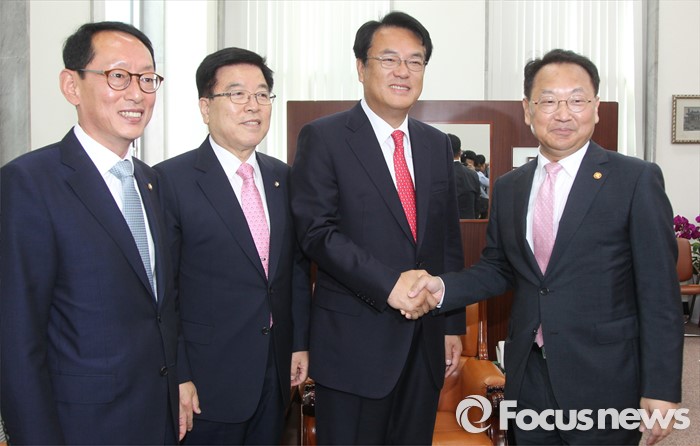 (서울=포커스뉴스) 정진석 새누리당 원내대표 등 원내지도부가 11일 오전 서울 여의도 국회를 방문한 유일호 경제부총리 겸 기획재정부 장관과 면담에 앞서 취재진을 향해 포즈를 취하고 있다. 왼쪽부터 김도읍 원내수석부대표, 김광림 정책위의장, 정 원내대표, 유일호 부총리.