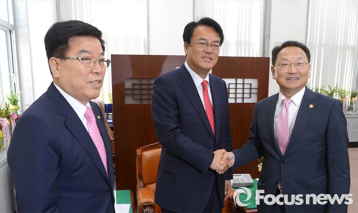 (서울=포커스뉴스) 정진석 새누리당 원내대표 등 원내지도부가 11일 오전 서울 여의도 국회를 방문한 유일호 경제부총리 겸 기획재정부 장관과 면담에 앞서 인사하고 있다. 왼쪽부터 김광림 정책위의장, 정 원내대표, 유일호 부총리.