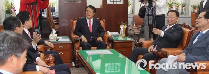 (서울=포커스뉴스) 정진석(오른쪽 세번째) 새누리당 원내대표 등 원내지도부가 11일 오전 서울 여의도 국회를 방문한 유일호(오른쪽 두번째) 경제부총리 겸 기획재정부 장관과 면담을 하고 있다.