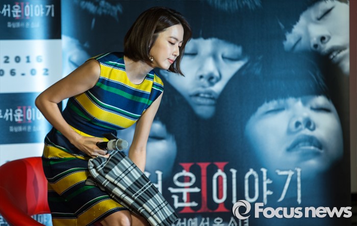 (서울=포커스뉴스) 11일 오전 서울 광진구 롯데시네마 건대입구점에서 열린 영화 '무서운이야기3' 제작보고회에 참석한 배우 홍은희가 자리에 앉고 있다.
