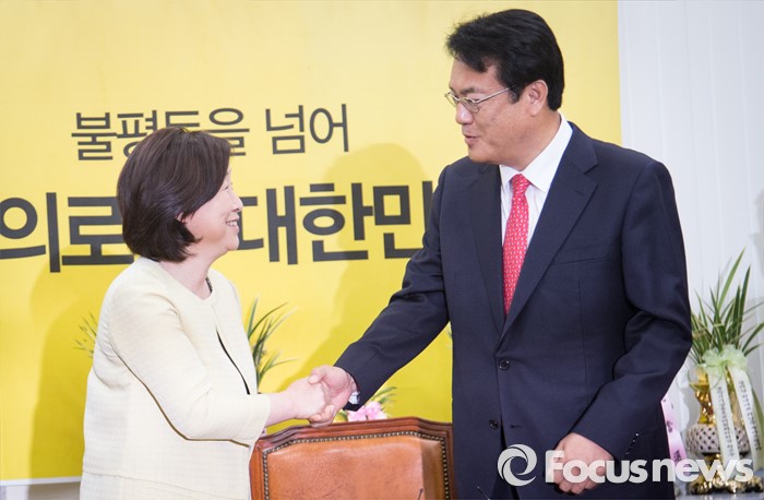 (서울=포커스뉴스) 정진석 새누리당 원내대표가 11일 오전 서울 여의도 국회에서 심상정 정의당 상임대표를 예방해 인사하고 있다.