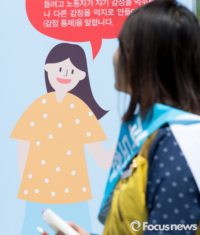 (서울=포커스뉴스) 11일 오전 서울 종로구 청계광장에서 감정노동전국네트워크가 감정노동자 권리보호 캠페인을 하고 있다.