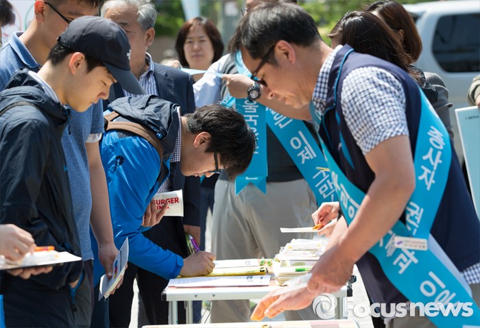 (서울=포커스뉴스) 11일 오전 서울 종로구 청계광장에서 감정노동전국네트워크가 감정노동자 권리보호 캠페인을 하고 있다.