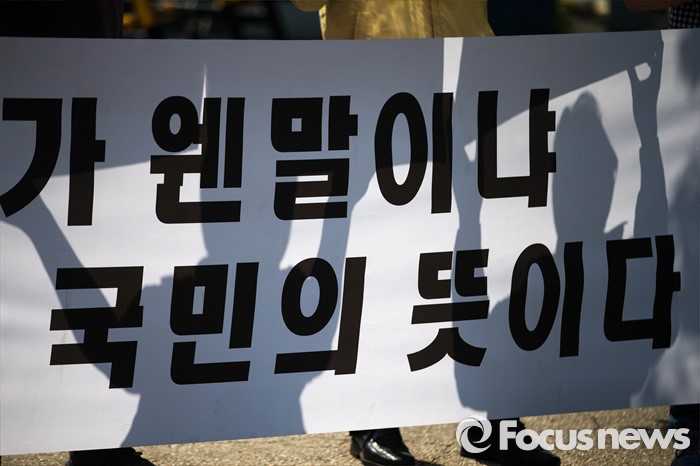 (서울=포커스뉴스) 11일 오전 서울 관악구 서울대학교 앞에서 사시존치를위한고시생모임 회원들이 교육부의 전수조사 결과 발표를 규탄하며 시위를 하고 있다.