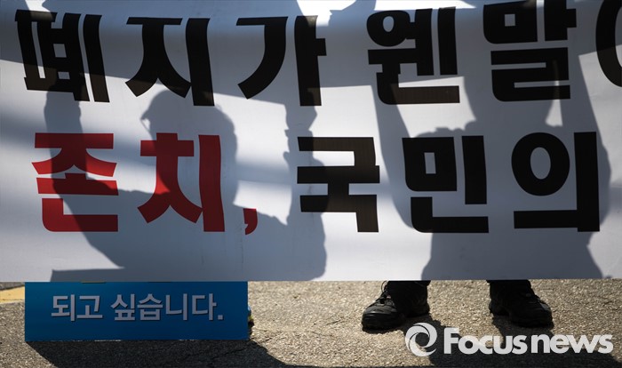 (서울=포커스뉴스) 11일 오전 서울 관악구 서울대학교 앞에서 사시존치를위한고시생모임 회원들이 교육부의 전수조사 결과 발표를 규탄하며 시위를 하고 있다.