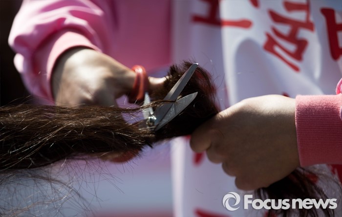 (서울=포커스뉴스) 11일 오전 서울 관악구 서울대학교 앞에서 사시존치를위한고시생모임 회원 황지나씨가 교육부의 전수조사 결과 발표를 규탄하며 삭발식을 하고 있다.