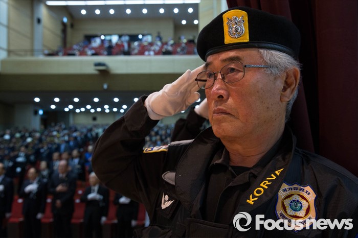 (서울=포커스뉴스) 11일 오전 서울 동작구 국립현충원에서 열린 '철기 이범석 장군 제44주기 추모제' 참석자들이 국민의례를 하고 있다.
