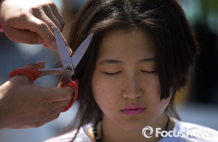 (서울=포커스뉴스) 11일 오전 서울 관악구 서울대학교 앞에서 사시존치를위한고시생모임 회원 황지나씨가 교육부의 전수조사 결과 발표를 규탄하며 삭발식을 하고 있다.