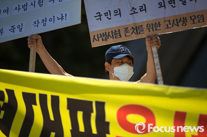 (서울=포커스뉴스) 11일 오전 서울 관악구 서울대학교 앞에서 사시존치를위한고시생모임 회원들이 교육부의 전수조사 결과 발표를 규탄하며 시위를 하고 있다.