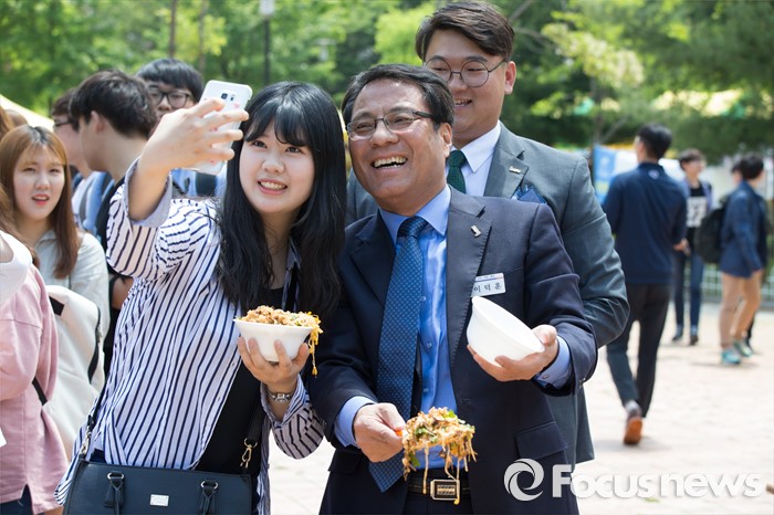 (대전=포커스뉴스) 11일 오전 대전 대덕구 한남대학교에서 이덕훈 총장이 개교 60주년 기념 대형 비빔밥을 나눠주던 도중 여학생과 셀카를 찍고 있다.