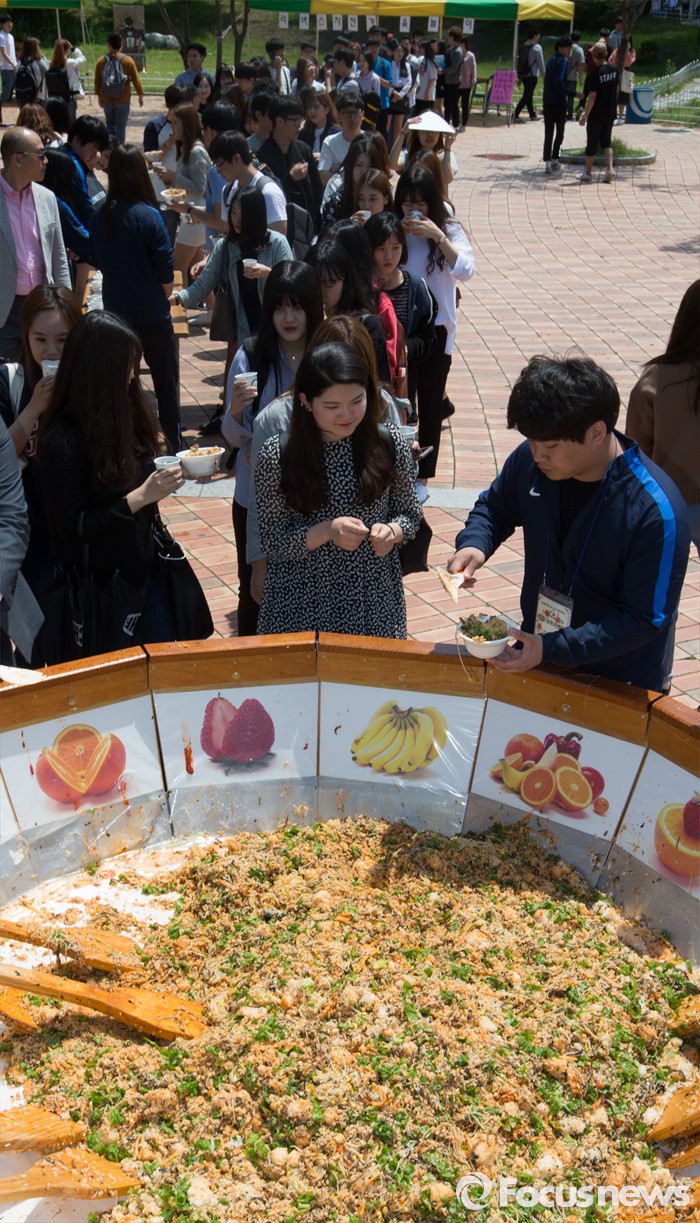 (대전=포커스뉴스) 11일 오전 대전 대덕구 한남대학교에서 이덕훈 총장과 학생들이 개교 60주년 기념 대형 비빔밥을 학생들에게 나눠주는 행사를 갖고 있다.