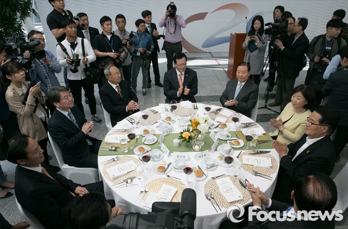 (서울=포커스뉴스) 11일 오후 서울 여의도 국회 의원회관에서 열린 20대 국회 초선의원 의정연찬회 오찬에 참석한 내빈들이 자리하고 있다. 가운데 위부터 시계방향으로 정의화 국회의장, 김원기 전 국회의장, 심상정 정의당 상임대표, 박지원 국민의당 원내대표, 박준영 당선인, 문진국 새누리당 당선인, 우상호 더불어민주당 원내대표, 안철수 국민의당 상임공동대표, 박관용 전 국회의장.