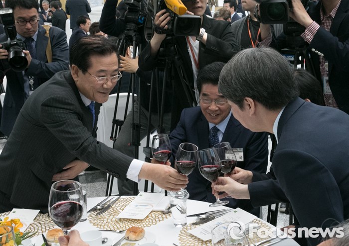 (서울=포커스뉴스) 11일 오후 서울 여의도 국회 의원회관에서 열린 20대 국회 초선의원 의정연찬회 오찬에 참석한 안철수(오른쪽) 국민의당 상임공동대표와 박준영 당선인이 건배를 하고 있다.