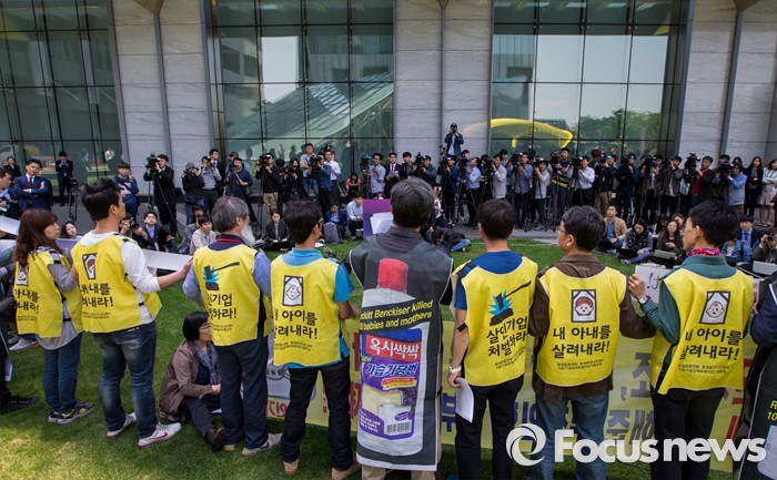 (서울=포커스뉴스)영국과 덴마크에서 옥시레킷벤키저 본사와 케톡스 본사를 항의 방문했던 가습기 살균제 피해자 유족과 시민단체가 11일 오후 서울 영등포구 여의도 옥시 한국본사 앞에서 귀국 기자회견을 갖고 있다.