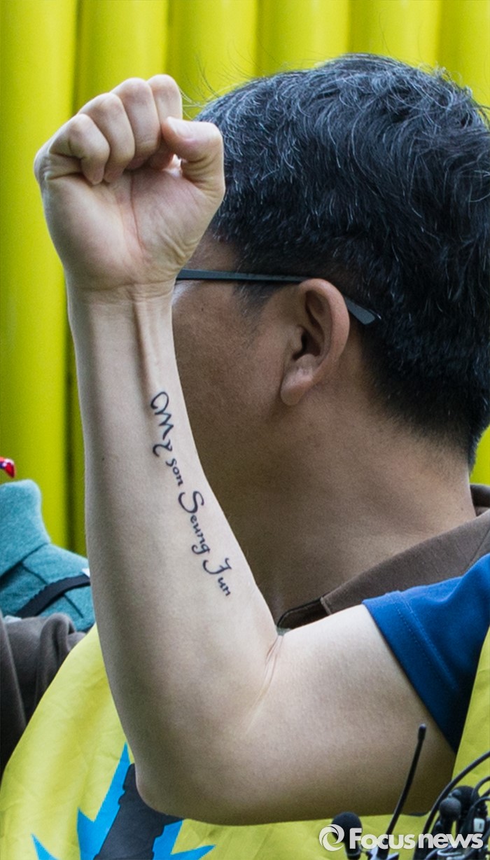 (서울=포커스뉴스)영국과 덴마크에서 옥시레킷벤키저 본사와 케톡스 본사를 항의 방문했던 가습기 살균제 피해자 유족 김덕종(40)씨가 11일 오후 서울 영등포구 여의도 옥시 한국본사 앞에서 열린 귀국 기자회견에 참석해 옥시를 규탄하는 구호를 외치고 있다. 김씨의 팔에 가습기 살균제 피해로 세상을 떠난 아들 승준군을 기리는 문신이 새겨져 있다.