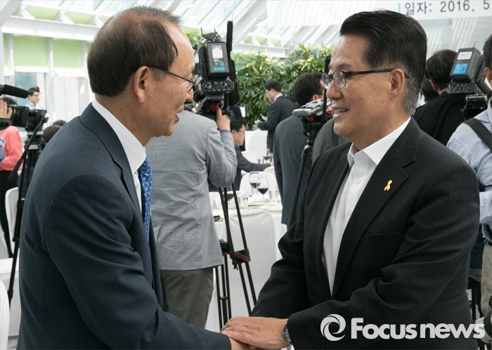 (서울=포커스뉴스) 11일 오후 서울 여의도 국회 의원회관에서 열린 20대 국회 초선의원 의정연찬회 오찬에 참석한 최운열(왼쪽) 더불어민주당 당선인과 박지원 국민의당 원내대표가 인사하고 있다.