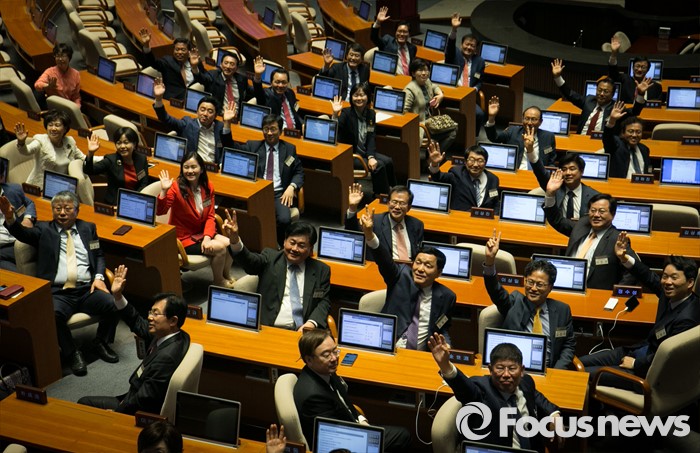 (서울=포커스뉴스) 11일 오후 서울 여의도 국회 본회의장을 방문한 20대 국회 초선 당선인들이 전자투표 시연 교육 등을 받은 뒤 취재진의 요청으로 손을 흔들고 있다.