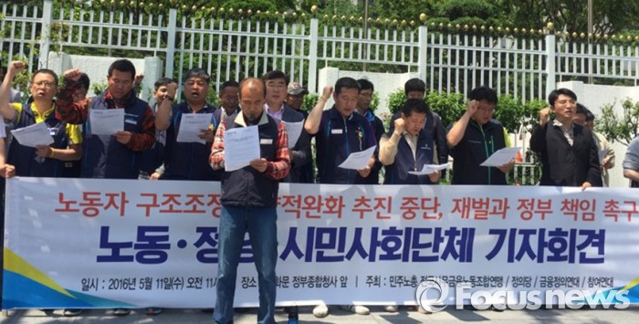 전국사무금융노동조합연맹, 금융정의연대, 참여연대 등의 단체는 11일 오전 서울 종로구 정부서울청사 앞에서 기자회견을 열고 정부의 부실기업 구조조정 방식에 대해 한 목소리로 비판했다.