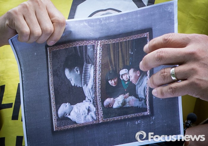 (서울=포커스뉴스)영국과 덴마크에서 옥시레킷벤키저 본사와 케톡스 본사를 항의 방문했던 가습기 살균제 피해자 유족 김덕종(40)씨가 11일 오후 서울 영등포구 여의도 옥시 한국본사 앞에서 열린 귀국 기자회견에 참석해 가습기 살균제 피해로 세상을 떠난 아들 승준군의 사진을 공개하고 있다.