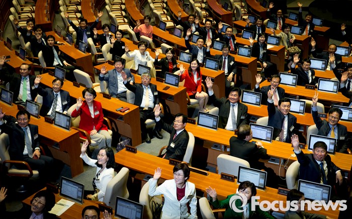 (서울=포커스뉴스) 11일 오후 서울 여의도 국회 본회의장을 방문한 20대 국회 초선 당선인들이 전자투표 시연 교육 등을 받은 뒤 취재진의 요청으로 손을 흔들고 있다.
