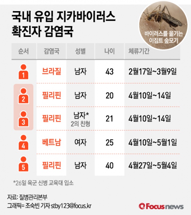 (서울=포커스뉴스) 국내 유입 지카바이러스 확진자의 감염국이 필리핀 3명, 베트남 1명, 브라질 1명인 것으로 나타났다.