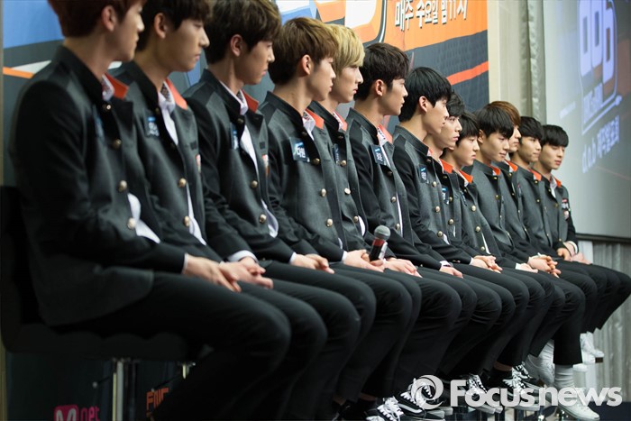(서울=포커스뉴스) 11일 오후 서울 마포구 스탠포드 호텔에서 Fnc 엔터테인먼트 소속 댄스팀과 밴드팀13명이 Mnet 'Dance or Band' 제작발표회에 참석해 질의응답 시간을 갖고 있다.