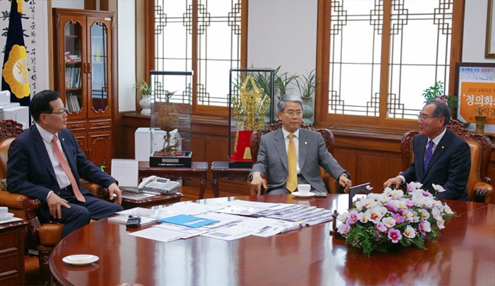 (서울=포커스뉴스) 이개호(오른쪽) 더불어민주당 의원과 김동철(가운데) 국민의당 의워 등이 11일 서울 여의도 국회의장실을 방문해 정의화 국회의장에게 5·18기념식 '임을 위한 행진곡' 제창을 위한 국회 차원의 대정부 촉구를 요청하고 있다. <사진제공=이개호 의원실>