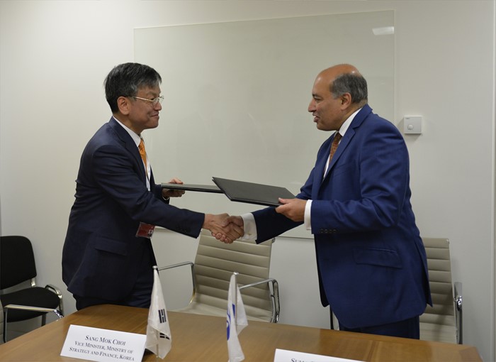 (서울=포커스뉴스) EBRD 연차총회 참석을 위해 런던을 방문 중인 최상목(왼쪽) 기획재정부 1차관이 수마 차크라바티 EBRD 총재와 경제 협력 강화 방안을 논의 후 악수를 하고 있다. <사진제공=기획재정부>