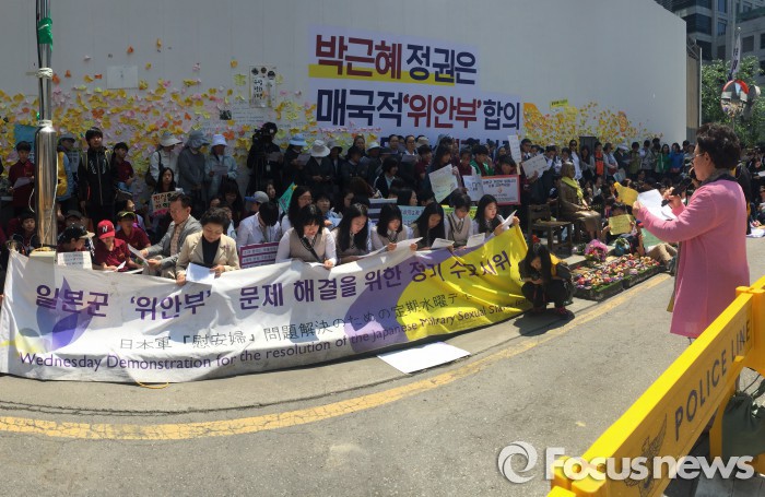 (서울=포커스뉴스) 한국정신대문제대책협의회(정대협)와 한국교회여성연합회가 11일 서울 종로구 옛 주한일본대사관 맞은편에서 1230차 일본군 위안부 문제해결을 위한 정기 수요집회를 열고 위안부 피해자 다큐멘터리 영화 '사과'의 국내 상영을 촉구했다.