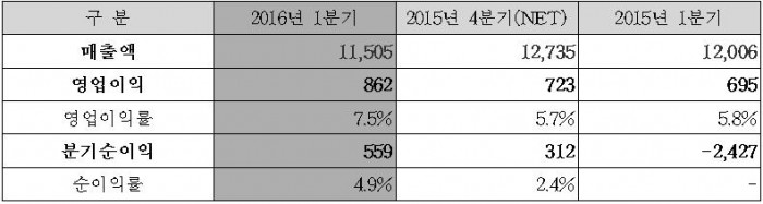 한편, 코오롱인더스트리의 1분기 매출액은 전년 동기(1조2006억원) 대비 4.2% 감소한 1조1505억원을 기록했다. 법인세비용차감전순이익과 분기순이익은 각각 764억원과 559억원이었다.코오롱인더스트리 실적 및 이익률 추이.(잠정실적, 단위:억원, IFRS 연결 기준)<자료제공=코오롱인더스트리>