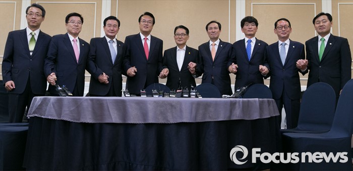 (서울=포커스뉴스) 11일 오후 서울 여의도 국회 귀빈식당에서 열린 3당 원내지도부 회동에 참석한 의원들이 취재진을 향해 포즈를 취하고 있다. 왼쪽부터 왼쪽부터 김성식 국민의당 정책위의장, 김광림 새누리당 정책위의장, 변재일 더불어민주당 정책위의장, 정진석 새누리당 원내대표, 박지원 국민의당 원내대표, 우상호 더불어민주당 원내대표, 박완주 원내수석부대표, 김도읍 새누리당 원내수석부대표, 김관영 국민의당 원내수석부대표.