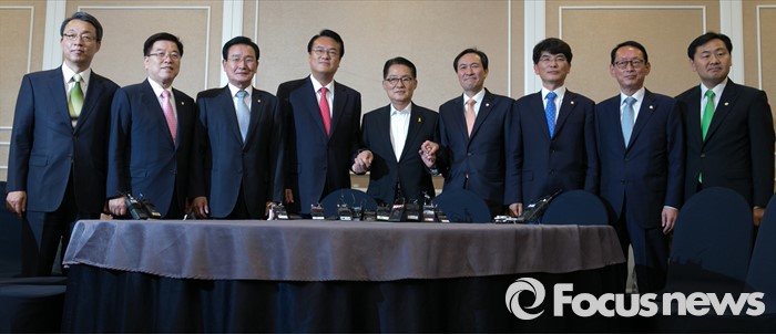 (서울=포커스뉴스) 11일 오후 서울 여의도 국회 귀빈식당에서 열린 3당 원내지도부 회동에 참석한 의원들이 취재진을 향해 포즈를 취하고 있다. 왼쪽부터 왼쪽부터 김성식 국민의당 정책위의장, 김광림 새누리당 정책위의장, 변재일 더불어민주당 정책위의장, 정진석 새누리당 원내대표, 박지원 국민의당 원내대표, 우상호 더불어민주당 원내대표, 박완주 원내수석부대표, 김도읍 새누리당 원내수석부대표, 김관영 국민의당 원내수석부대표.