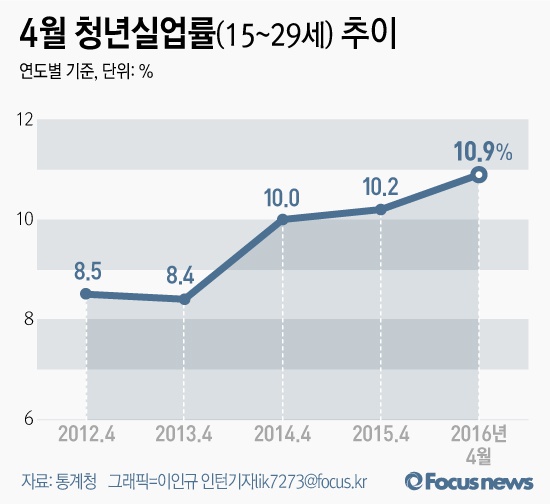 이 실장은 “노동시장 이중구조화 및 일자리 사다리는 매우 구조적인 문제로 현재 정부의 청년일자리정책이 이쪽에 맞춰져 있지도 않아 빠른 시일 내에 개선되기는 힘든 상황”이라며 “처음부터 좋은직장을 얻기 위해 졸업 후에도 3~5년 취업준비를 할 수밖에 없다”고 덧붙였다.(서울=포커스뉴스) 통계청이 11일 발표한 '4월 고용동향'에 따르면 4월 청년 실업률은 10.9%로 전년 동월 대비 0.7%포인트 증가했다. 2016.05.11 이인규 인턴기자