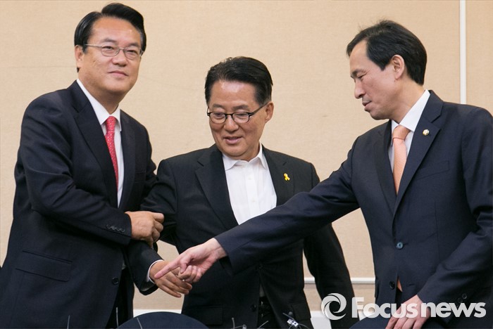 (서울=포커스뉴스) 11일 오후 서울 여의도 국회 귀빈식당에서 열린 3당 원내지도부 회동에 참석한 정진석(왼쪽부터) 새누리당 원내대표, 박지원 국민의당 원내대표, 우상호 더불어민주당 원내대표가 자리 논의를 하고 있다.