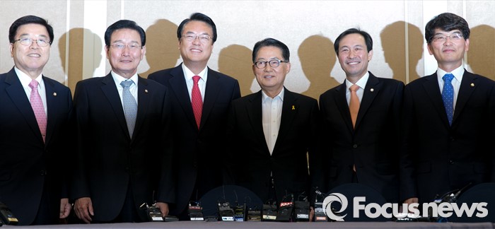 (서울=포커스뉴스) 11일 오후 서울 여의도 국회 귀빈식당에서 열린 3당 원내지도부 회동에 참석한 의원들이 취재진을 향해 포즈를 취하고 있다. 왼쪽부터 김광림 새누리당 정책위의장, 변재일 더불어민주당 정책위의장, 정진석 새누리당 원내대표, 박지원 국민의당 원내대표, 우상호 더불어민주당 원내대표, 박완주 원내수석부대표.