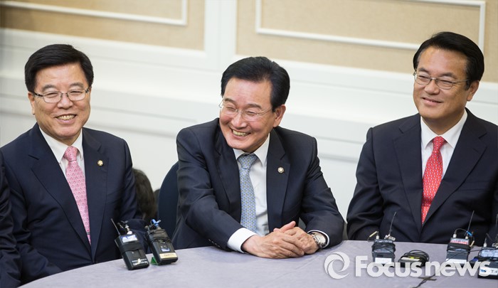 (서울=포커스뉴스) 11일 오후 서울 여의도 국회 귀빈식당에서 열린 3당 원내지도부 회동에 참석한 의원들이 웃고 있다. 왼쪽부터 김광림 새누리당 정책위의장, 변재일 더불어민주당 정책위의장, 정진석 새누리당 원내대표.