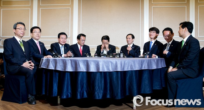(서울=포커스뉴스) 11일 오후 서울 여의도 국회 귀빈식당에서 열린 3당 원내지도부 회동에 참석한 의원들이 논의를 하고 있다.왼쪽부터 김성식 국민의당 정책위의장, 김광림 새누리당 정책위의장, 변재일 더불어민주당 정책위의장, 정진석 새누리당 원내대표, 박지원 국민의당 원내대표, 우상호 더불어민주당 원내대표, 박완주 원내수석부대표, 김도읍 새누리당 원내수석부대표, 김관영 국민의당 원내수석부대표.