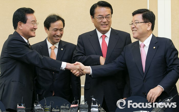(서울=포커스뉴스) 11일 오후 서울 여의도 국회 귀빈식당에서 열린 3당 원내지도부 회동에 참석한 의원들이 인사하고 있다. 왼쪽부터 변재일 더불어민주당 정책위의장, 우상호 원내대표, 정진석 새누리당 원내대표, 김광림 정책위의장.