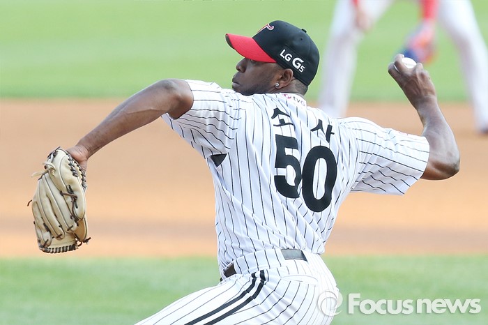 △ 힘차게 볼을 뿌리는 LG 선발투수 소사
