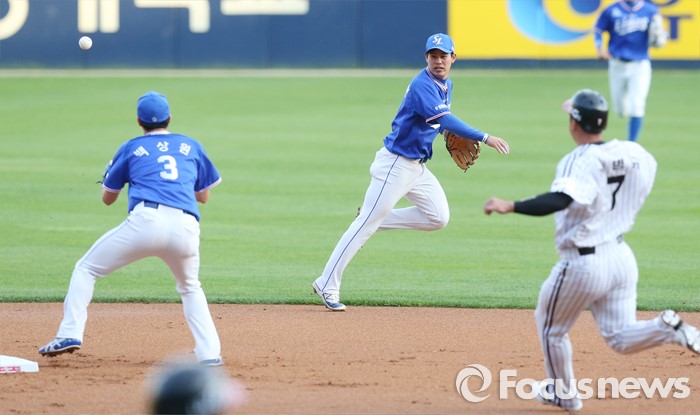 (서울=포커스뉴스) 11일 서울 잠실구장에서 열린 2016 프로야구 삼성-LG 경기 1회말 2사 1,2루에서 삼성 유격수 김재현이 LG 채은성의 2루쪽 땅볼을 잡아 LG 1루주자 이병규를 2루에서 포스아웃 시키고 있다.
