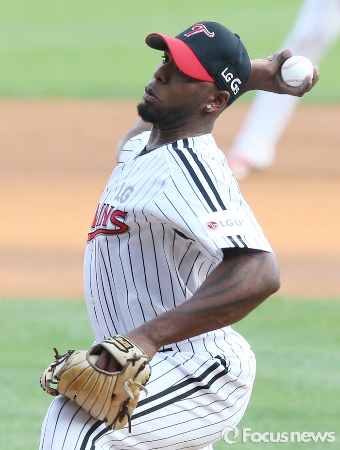 | △ 힘차게 볼을 뿌리는 LG 선발투수 소사 |