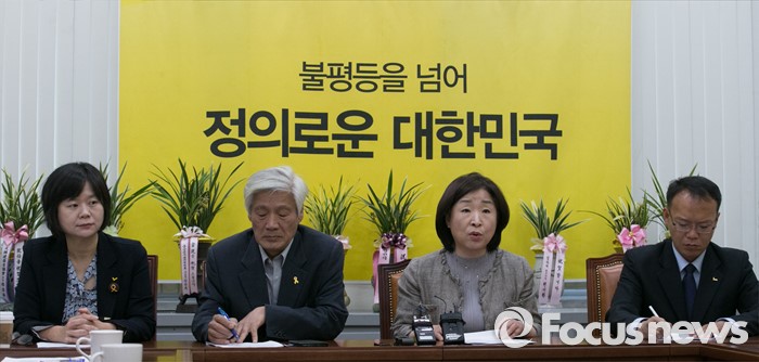 (서울=포커스뉴스) 12일 오전 서울 여의도 국회에서 열린 정의당 상무위원회의에 참석한 심상정 상임대표가 모두발언을 하고 있다. 왼쪽부터 이정미 원내수석부대표, 김세균 공동대표, 심 대표, 나경채 공동대표.