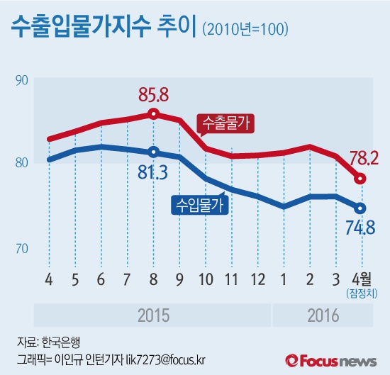 (서울=포커스뉴스) 12일 한국은행이 공개한 ‘4월 수출입물가지수'를 보면 지난달 수출물가는 78.19로 전월 대비 3.4% 하락했다. 수입물가는 74.77로 전월 대비 1.9% 하락했다.