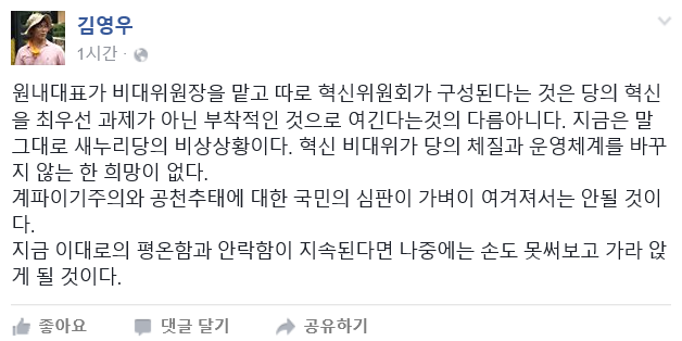 비박계는 이같은 결정에 대해 실질적인 권한이 없는 혁신위라며 비판을 제기하고 있다.김영우 새누리당 의원 페이스북 캡쳐 화면. 2016.05.12 류연정 기자 j4837415@focus.co.kr
