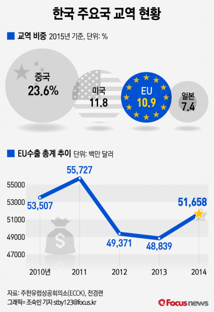 (서울=포커스뉴스) 12일 전경련과 주한유럽상공회의소(ECCK)에 따르면 미국·중국과 함께 3대 교역 대상국인 EU가 자유무역협정(FTA) 5년간 교역규모에서 14% 이상 증가하며 대(對)한국 최대 투자주체로 부상한 것으로 나타났다.