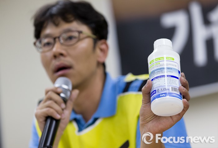 (서울=포커스뉴스) 12일 오전 서울 중구 환경재단 레이첼카슨홀에서 가습기 살균제 피해자 가족인 안성우씨가 세퓨에 원료를 공급한 덴마크 케톡스(KeTox)사 항의 방문 결과와 현지 조사기록을 발표하고 있다.