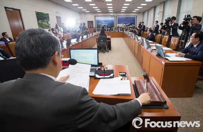 (서울=포커스뉴스) 김동철 국토교통 위원장이 12일 오전 서울 여의도 국회에서 열린 국토교통위원회 전체회의에서 의사봉을 두드리고 있다.