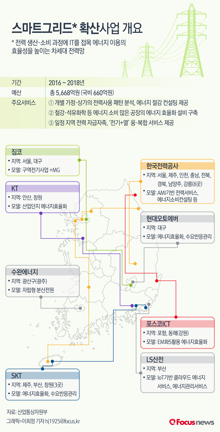 스마트그리드란 기존 전력망에 정보통신 기술을 적용해 전력공급자와 소비자가 실시간으로 정보를 교환, 에너지 효율을 극대화하는 전력망이다. 이번 확산사업은 오는 2018년까지 진행되며 총 5568억원의 예산이 투입된다.