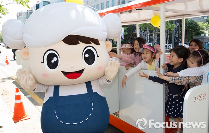 (대전=포커스뉴스) 유성온천문화축제를 하루 앞둔 12일 오전 대전 유성구 유성온천문화공원 족욕장을 찾은 어린이들이 코끼리 열차를 타고 축제 마스코트인 유성이와 인사를 하고 있다. 유성온천문화축제는 13일부터 15일까지 열리며 국내 최초로 한방족욕카페를 개장해 태양인과 태음인, 소양인, 소음인 사상체질별 맞춤 족욕장을 운영한다.