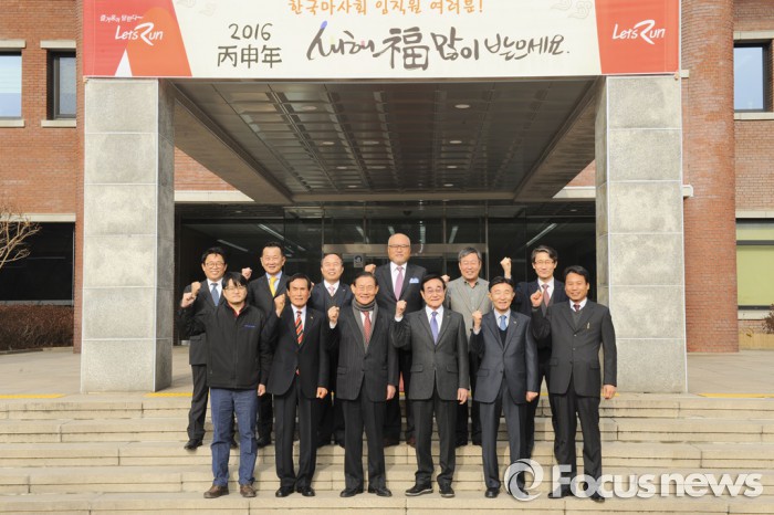 현명관 한국마사회 회장은 "고객중심경영을 기치로 내걸고 다양한 노력을 기울인 덕분에 올해 고객만족도 조사 1위, 부패방지 시책평가 최우수등급, 건전화 평가 A+ 달성 등 가시적인 성과를 거둘 수 있었다"고 소감을 전했다.현명관 한국 마사회 회장(앞줄 왼쪽에서 4번째)과 본부장들의 모습. <사진제공=한국마사회>